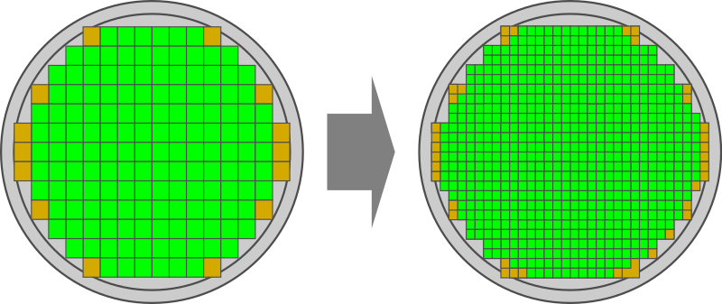 - Увеличивается удельная площадь пластины, содержащей полноценные чипы (отмеченные зелёным цветом на рисунке выше).