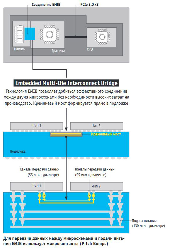 Здесь для объединения кристалла графического процессора AMD Vega с кристаллом высокоскоростной HBM-памяти используется технология объединения кристаллов, получившая название Intel EMIB (Embedded Multi-die Interconnect Bridge), в которой вместо большого объединяющего кристалла используется как раз подложка с кремниевыми каналами передачи данных (кремниевый мост).