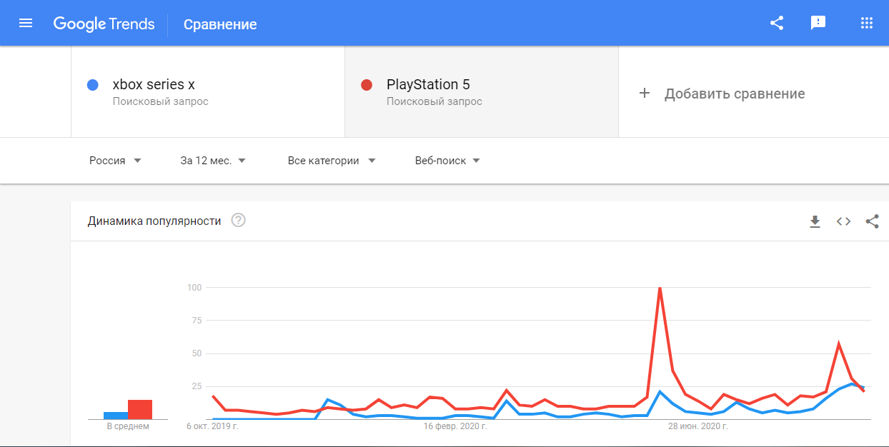 С помощью анализатора популярности тех или иных поисковых запросов под названием Google Trends, можно легко определить, какой приставкой пользователи интересуются больше. Наглядная и доступная всем статистика показывает, что большинство жителей России отдаёт предпочтение PS5, а вовсе не Xbox X. Microsoft единожды удалось обогнать Sony в период с 8 по 14 декабря 2019 года. В остальное время о конкуренции между устройствами не могло быть и речи. В среднем процент популярности составляет примерно 74% к 26% у PlayStation 5 и Xbox Series X соответственно. В некоторых отдельных регионах РФ (Камчатский край, Курганская область, Магаданская область, Сахалинская область, Костромская область и т.д.) PS5 имеет все 100% поисковых запросов. Внушительное число запросов (около 45% от общего количества) наблюдается только в Мурманской и Смоленской областях.