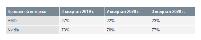 По данным портала Pcgameshardware, в третьем квартале 2020 года nVidia смогла реализовать 77% от общего числа проданным видеокарт, а AMD – оставшиеся 23%. В сравнении с прошлым годом рост количества проданных устройств составил около 13,4%, что на 9,1% больше. Дальнейшее развитие событий предугадать сложно.