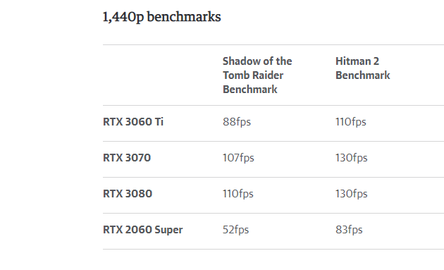 В подтверждение своих высоких оценок видеокарты RTX 3060 Ti портал engadget привел результаты тестирования в двух играх: Shadow of the Tomb Raider и Hitman 2. Среди RTX 3080, 3070, 3060 Ti и 2060 Super бюджетная версия (3060 Ti) смогла добиться 88 fps в первой игре и 110 fps во второй. У 2060 Super значения не превышали 52/83 fps. Все тесты проводились в 1440p в связке с процессором Intel Core i7-8700K.
