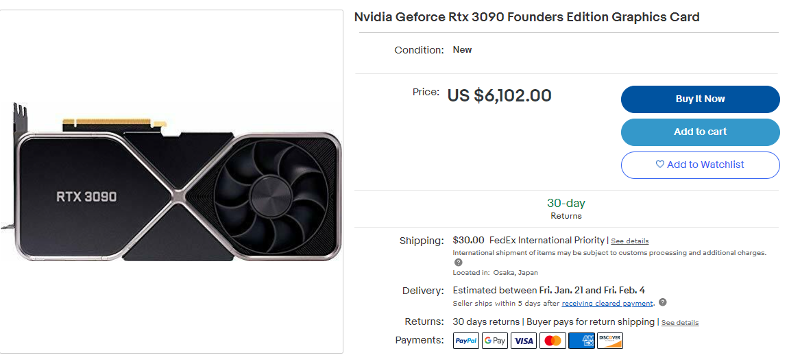 В начале майнингового кризиса хитрые продавцы продавали новые нераспечатанные карты в два раза дороже, чем рекомендует производитель, и это казалось им выгодной сделкой. Немного после они перешли на 3-кратную модель. Если так карту оценили в $500, дешевле её $1 500 её найти было сложно. Недавно особенно жадные спекулянты решили, что пришло время продавать карты в 4 раза дороже. Так, за новую RTX 3090 Founders Edition на eBay уже просят $6 100 при рекомендуемой цене в $1 500. Asus TUF Gaming GeForce RTX 3090 OC Edition продавец оценил в $6 300. На одних лишь двух таких экземплярах спекулянт хочет заработать почти $13 000.