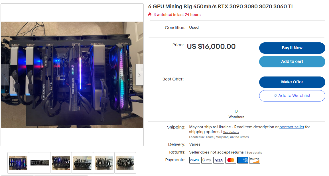 В том же магазине продаётся майнинговая установка за $16 000. В её комплектацию входят 5 карт серии RTX 30 без LHR и одна RTX 30 с LHR общей мощностью в 450 Mh/s. За такую сумму покупатель получит RTX 3090, 3080, 3070 и 3 штуки RTX 3060 Ti. Все карты были в активном использовании более полугода. Хотя общая рекомендованная стоимость для всех ускорителей не превысит $3 800, продавец в своей правоте уверен и объявление удалять не собирается.