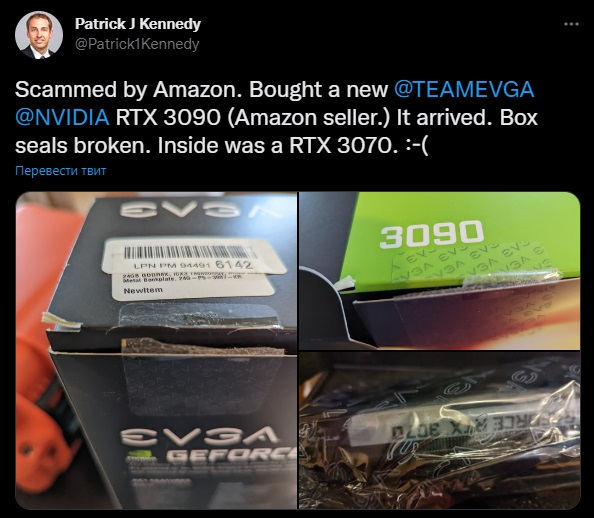 Про второй случай рассказал гражданин США Патрик Кеннеди. После оформления заявки на EVGA GeForce RTX 3090 и получения посылки в коробке лежала не желаемая флагманская модель, а средне-бюджетная GeForce RTX 3070. В данном случае вернуть средства будет чуть сложнее потому что процесс распаковки записан на видео не был, а это означает, что подменить устройства он мог и сам.