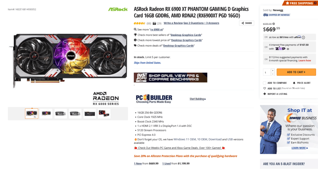 Чипы AMD тоже дешевеют: топовая Radeon RX 6900 XT на Newegg доступна за $669, что примерно на 34% меньше, чем карта должна стоить в рознице.