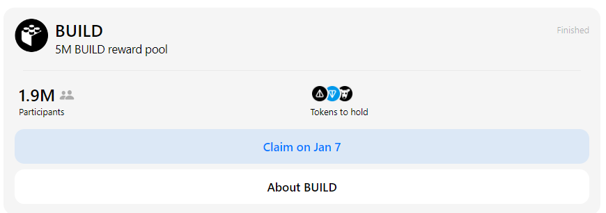 Лаунчпул earn от создателей Notcon и Dogs недавно завершил первый аирдроп токен $BUILD от приложения Communities . Всего было распределено 5 миллионов монет. Для получения монет было создано 4 пула: для держателей NOT, TON, DOGS и для пользователей, у которых высший уровень в приложении Notcoin. Листинг $BUILD запланирован на 7 января 2025 года.