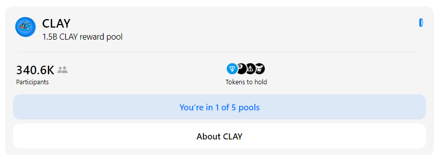 Второй аирдроп 1.5 миллиарда $CLAY проводится с 19.12.24 по 24.12.24. В этот раз был добавлен пятый пул для держателей токена ANON. Распределение монет в пулах выглядит следующим образом: