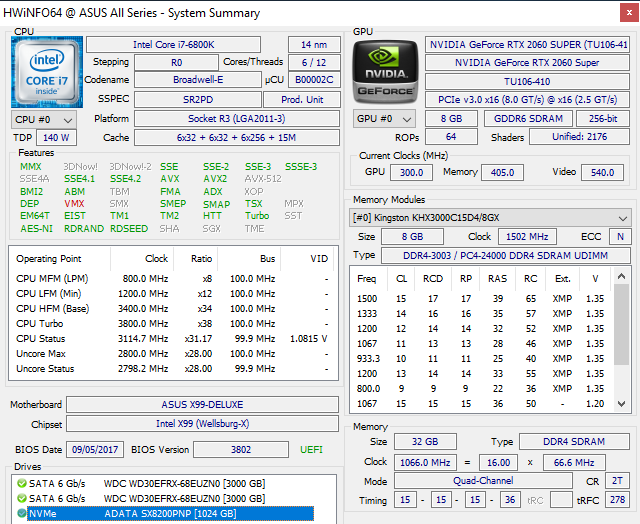 - память: Kingstone KHX3000C15 (4x8 ГБ, @2133 МГц);