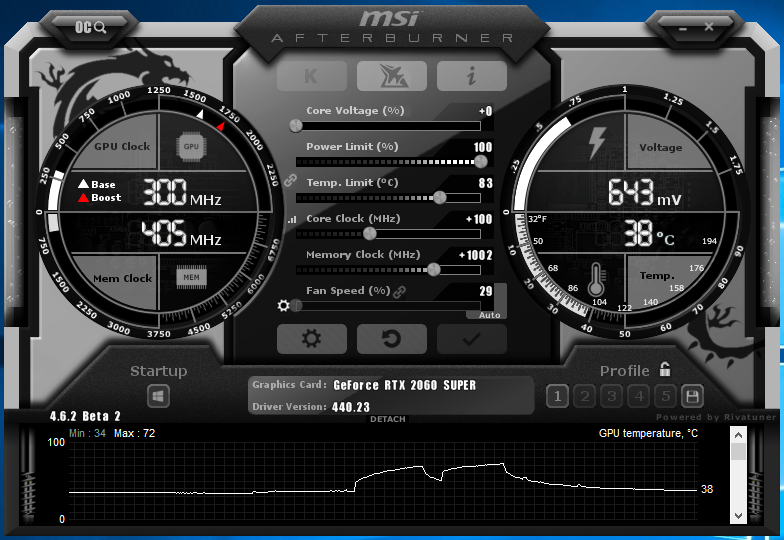 Перейдем к разгону, из-за невозможности изменить Powerlimit ограничимся повышением частоты видеоядра на 100 МГц и видеопамяти на 1000 МГц.