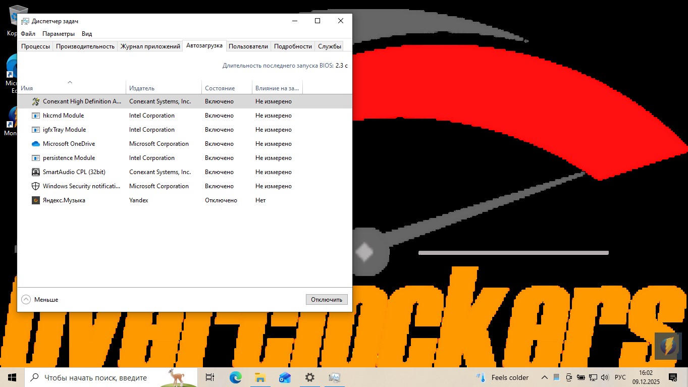 Система загрузилась. Я увидел чистый рабочий стол. И первое, что я сделал — открыл диспетчер задач (Ctrl+Shift+Esc). Перешёл на вкладку «Автозагрузка» и отключил там всё, что не было драйвером или системной службой. Это самое важное. На скриншоте состояние автозагрузки до отключения.