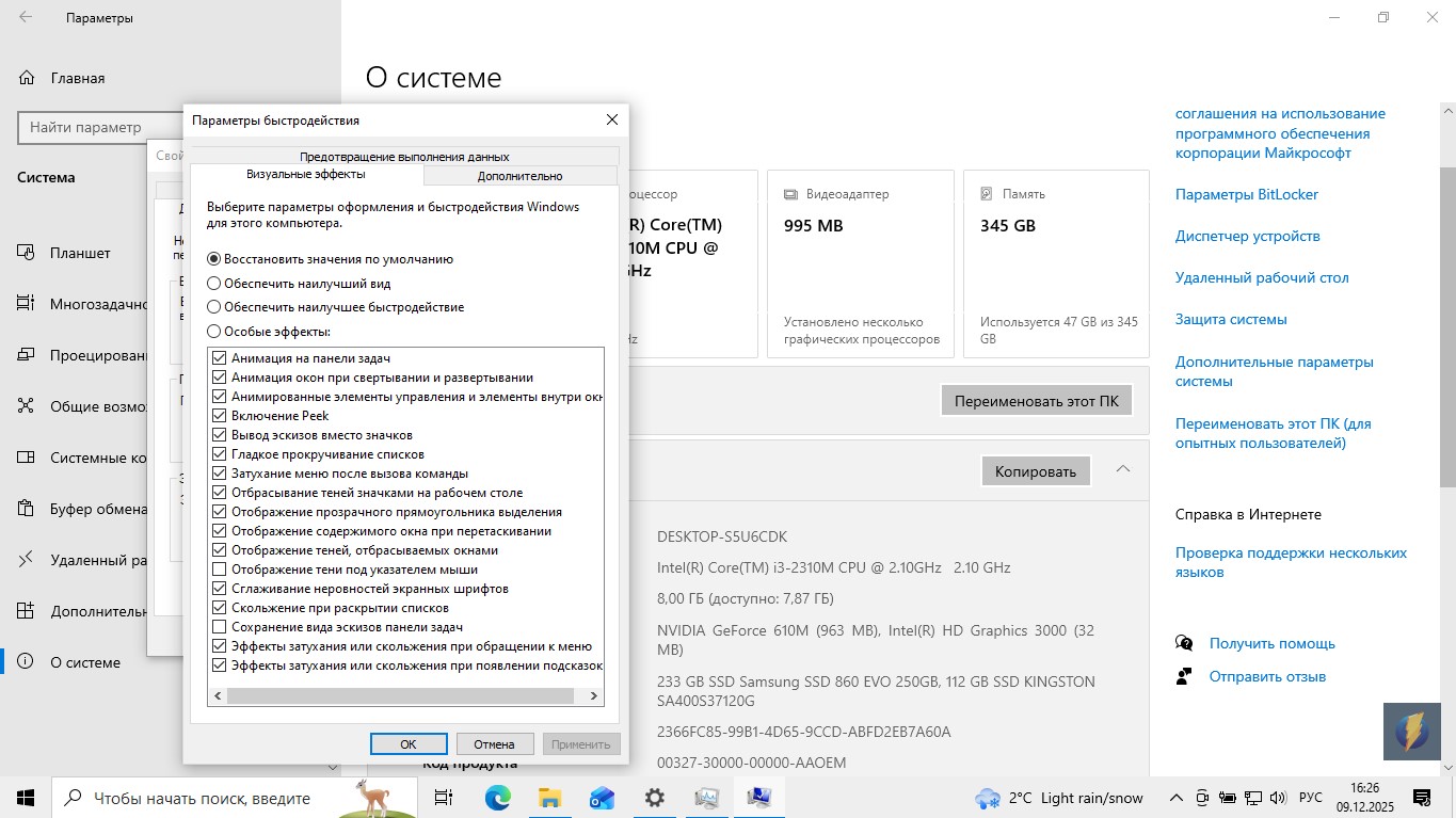 Затем пошёл глубже: «Параметры» -> «Система» -> «О системе» -> «Дополнительные параметры системы». В новом окне на вкладке «Дополнительно» нажал кнопку «Параметры» в разделе «Быстродействие».