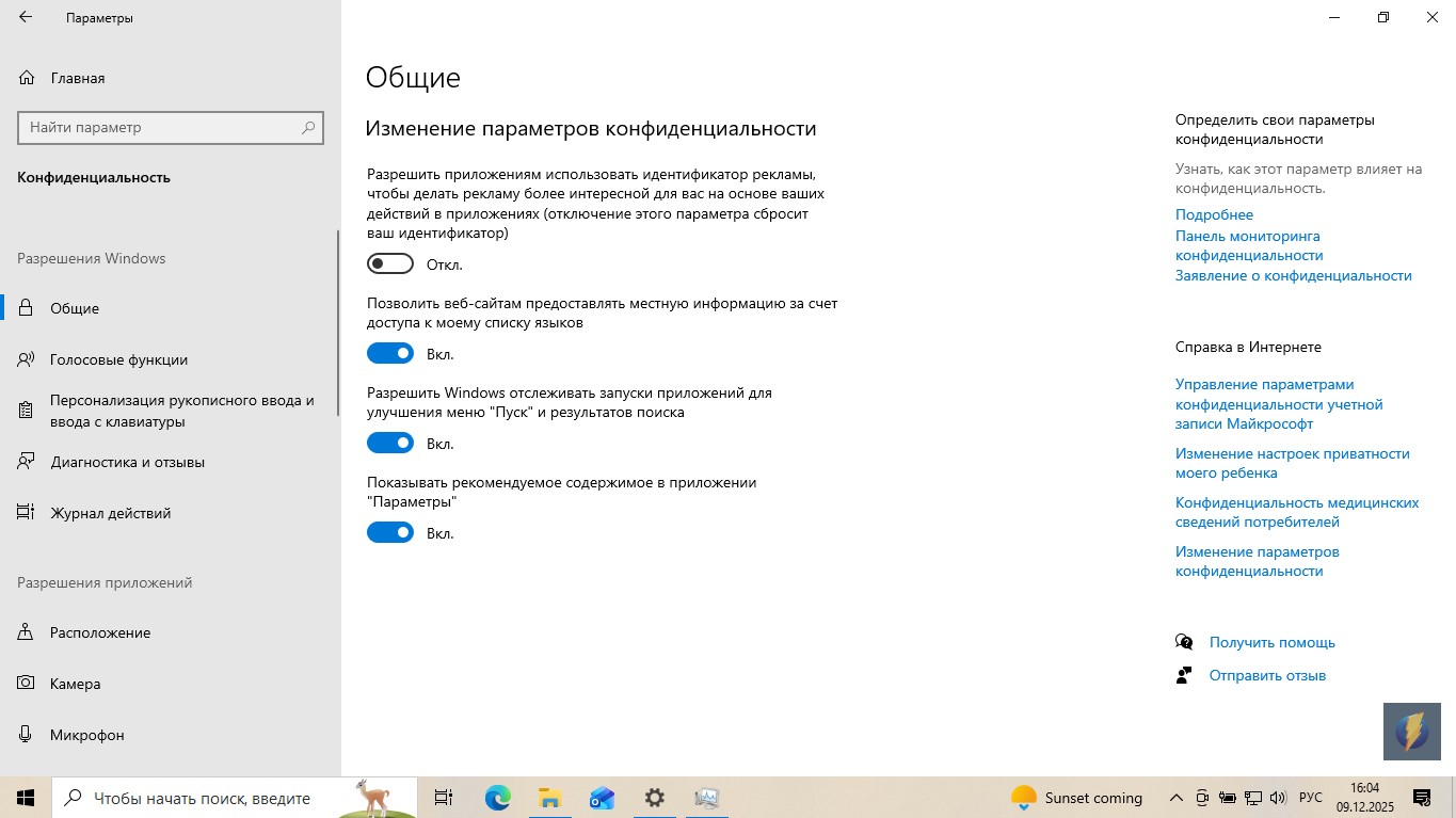 Потом я открыл «Параметры» и зашёл в «Конфиденциальность». Это главное место, где система собирает о вас данные. В разделе «Общие» я выключил все тумблеры. А вот, как было до отключения: