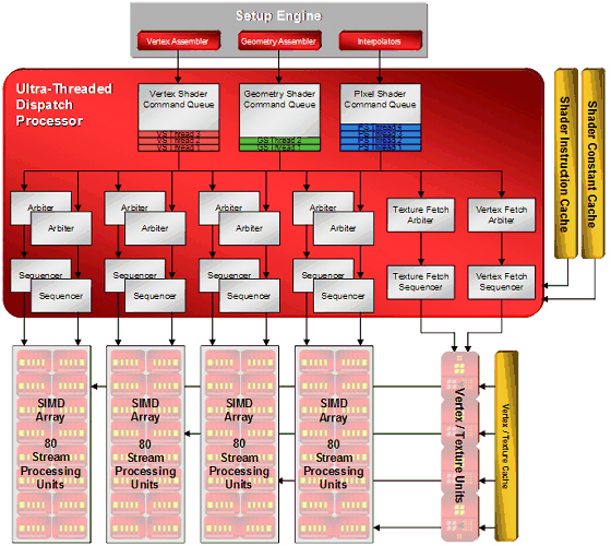 SPU в чипах микроархитектуры TeraScale были объединены в SIMD-массивы по 16 штук в каждом, при этом в диспетчере потоков (Ultra-Threaded Dispatch Processor) на каждый SIMD-массив приходилось по два арбитра и секвенсора, что давало возможность обрабатывать по 2 потока инструкций на SIMD-массив. Арбитр принимает решение о том, какой из потоков инструкций, стоящих в очереди на исполнение, следует выполнить на конкретном SIMD-массиве, а секвенсор способен в целях увеличения производительности менять порядок инструкций в потоке, отправленном на исполнение. Непосредственно чип R600 содержит 4 описанных SIMD-массива и способен, таким образом, выполнять до 8 потоков инструкций одновременно. Единственное ограничение заключалось в том, что всякий отдельно взятый SPU из конкретного SIMD-массива мог выполнять инструкции только над одним потоком данных. Под потоком данных здесь, как и ранее, понимается вершина, полигон или пиксель, над которым необходимо выполнить некоторую шейдерную программу. Обратите также внимание, что очереди команд для каждого типа шейдеров (вершинный, геометрический и пиксельный) раздельные.