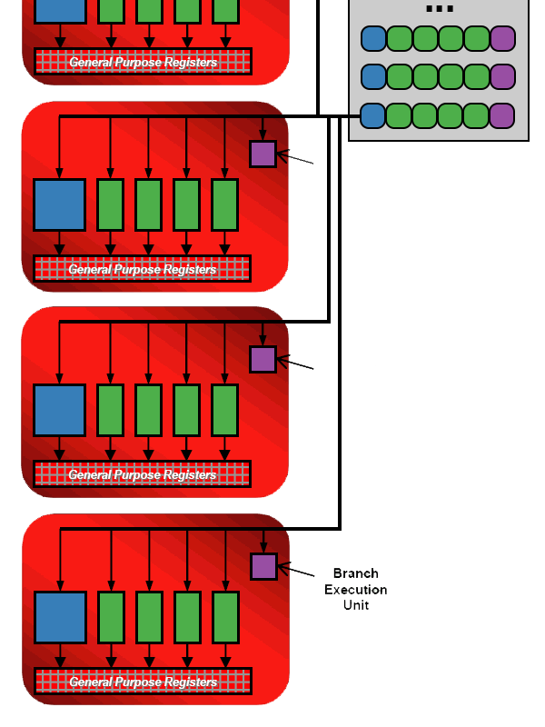 Конкретно в случае микроархитектуры TeraScale первого поколения каждое слово машинной команды может содержать до 6 независимых инструкций, 5 математических и 1 управляющую — ровно столько, сколько независимых исполнительных устройств имеется в составе каждого блока SPU. В идеальном сценарии всякая очередная длинная машинная команда исполняемого шейдерного кода содержит ровно указанное выше количество инструкций. Тогда в рамках SIMD подхода легко и просто получается параллельно выполнить такую команду на множестве блоков SPU, которые при этом будут использованы максимально эффективно — ни один из 5 потоковых процессоров, ровно как и устройство выполнения ветвлений, простаивать не будет.