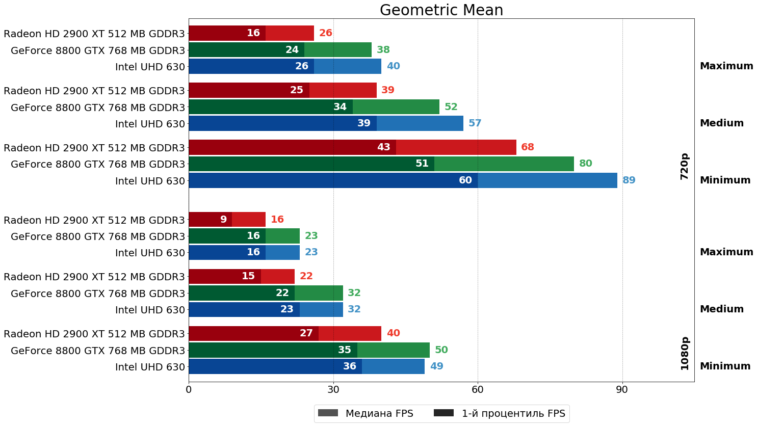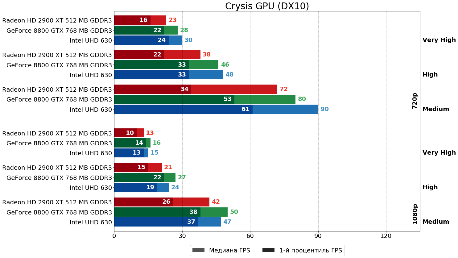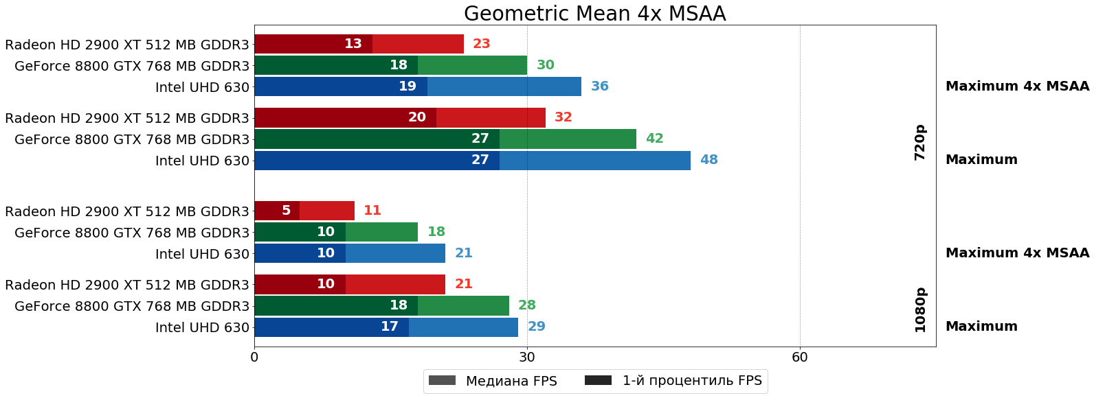 Можно видеть, что и так существенное отставание HD 2900 XT от 8800 GTX в самом "тяжёлом" графическом режиме (на максимальных настройках в FHD-разрешении), ещё больше усугубляется включением сглаживания MSAA — после активации 4x MSAA отставание "красной" карты по среднему и минимальному показателям увеличивается с 33% и 80% до 64% и 100%, соответственно. В HD-разрешении существенного роста указанных показателей не наблюдается, так как, по всей видимости, шейдерной мощи у R600 одновременно для выполнения и кода шейдеров, и заключительных этапов 4x MSAA здесь ещё хватает. Отметим также, что "встройка" Intel при включении MSAA не "просела гораздо сильнее", чем 8800 GTX, как писалось в комментарии к предыдущей статье, а даже отчасти наоборот немного увеличила свой отрыв от 8800 GTX. Возможно, "встройка встройке — рознь" и Gen9.5 уже не так плохо справляется с MSAA.