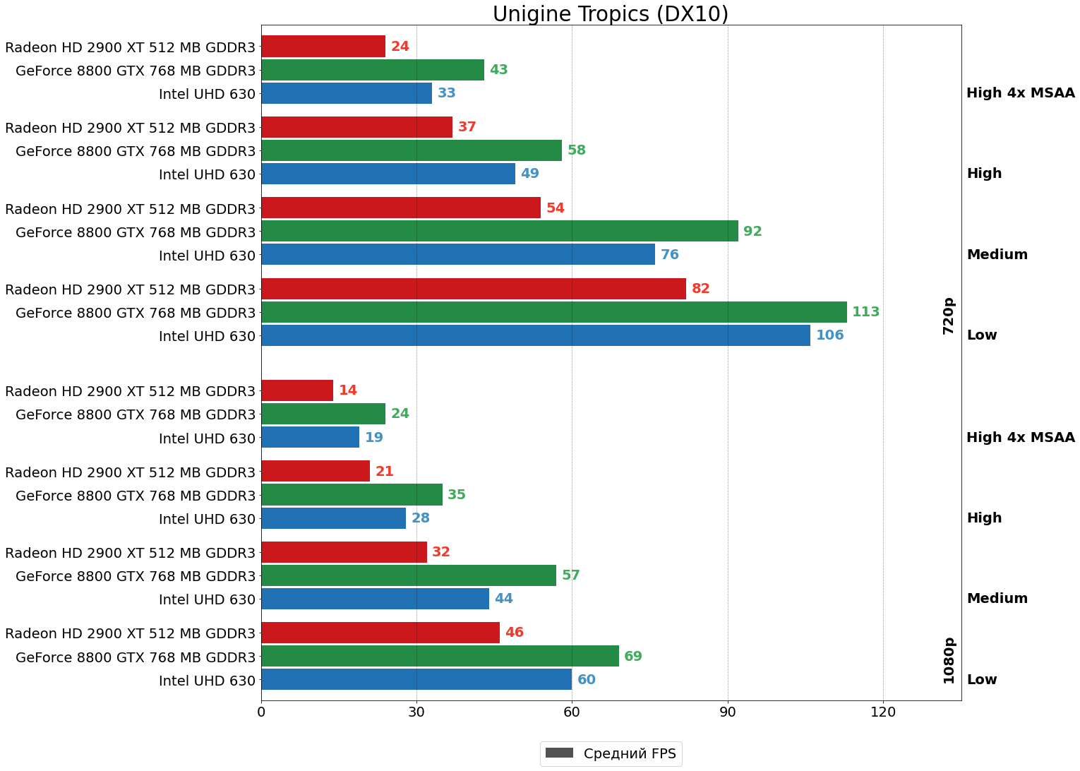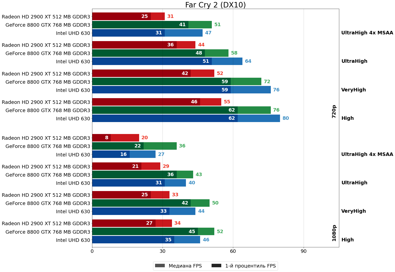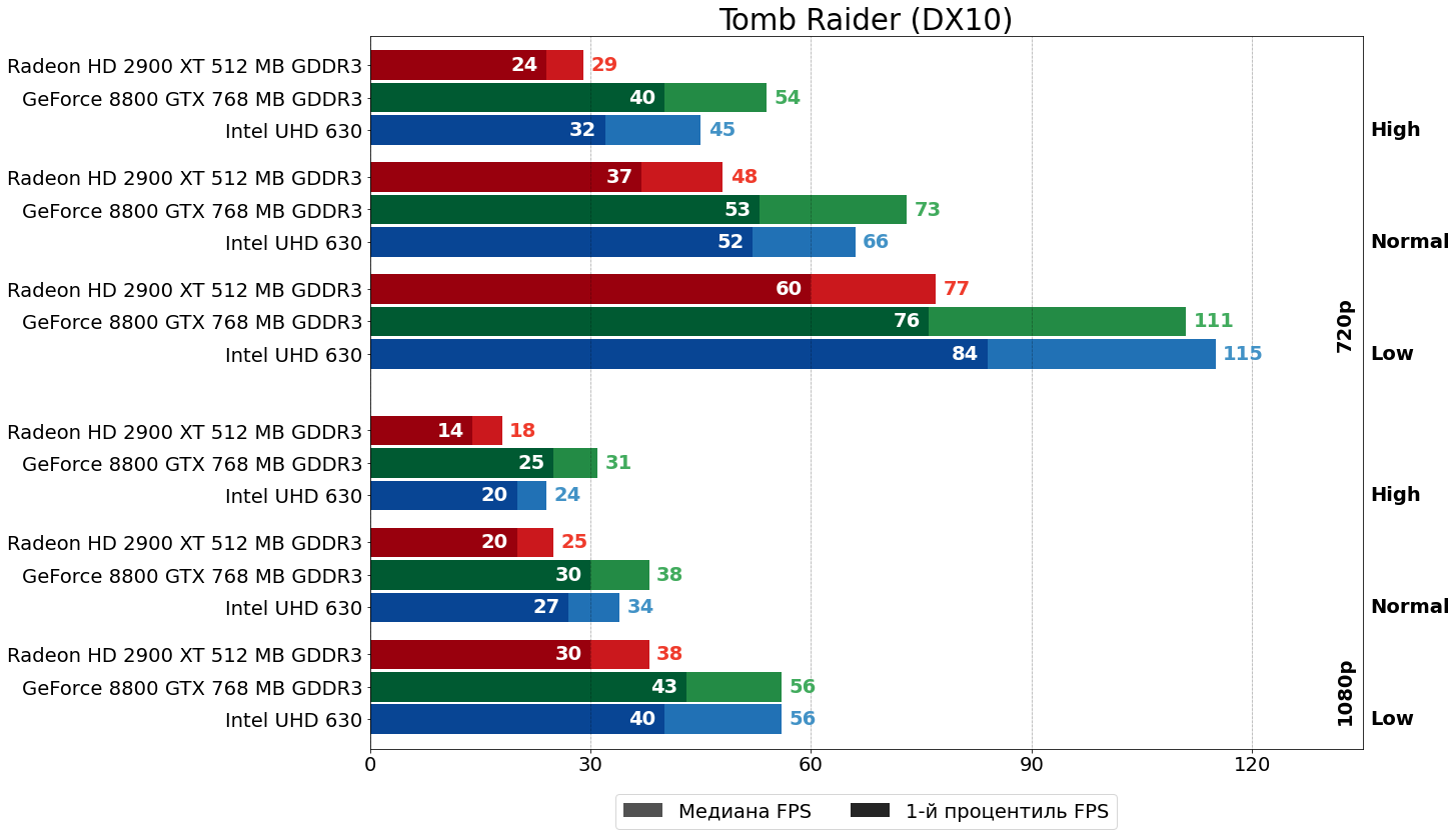 Можно видеть, что и так существенное отставание HD 2900 XT от 8800 GTX в самом "тяжёлом" графическом режиме (на максимальных настройках в FHD-разрешении), ещё больше усугубляется включением сглаживания MSAA — после активации 4x MSAA отставание "красной" карты по среднему и минимальному показателям увеличивается с 33% и 80% до 64% и 100%, соответственно. В HD-разрешении существенного роста указанных показателей не наблюдается, так как, по всей видимости, шейдерной мощи у R600 одновременно для выполнения и кода шейдеров, и заключительных этапов 4x MSAA здесь ещё хватает. Отметим также, что "встройка" Intel при включении MSAA не "просела гораздо сильнее", чем 8800 GTX, как писалось в комментарии к предыдущей статье, а даже отчасти наоборот немного увеличила свой отрыв от 8800 GTX. Возможно, "встройка встройке — рознь" и Gen9.5 уже не так плохо справляется с MSAA.