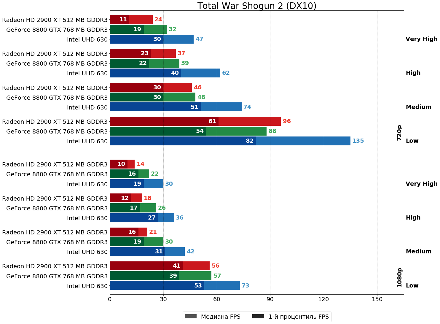 В Total War Shogun 2 ускорителю HD 2900 XT вообще удаётся местами вырваться вперёд, пускай и незначительно — в HD-разрешении за исключением очень высоких настроек победа за "красной" картой. На очень высоких и в FHD за исключением низких настроек впереди уже вновь ускоритель NVIDIA — всё-таки блоков ROP и TMU в R600 положили маловато, это уже совершенно очевидно.