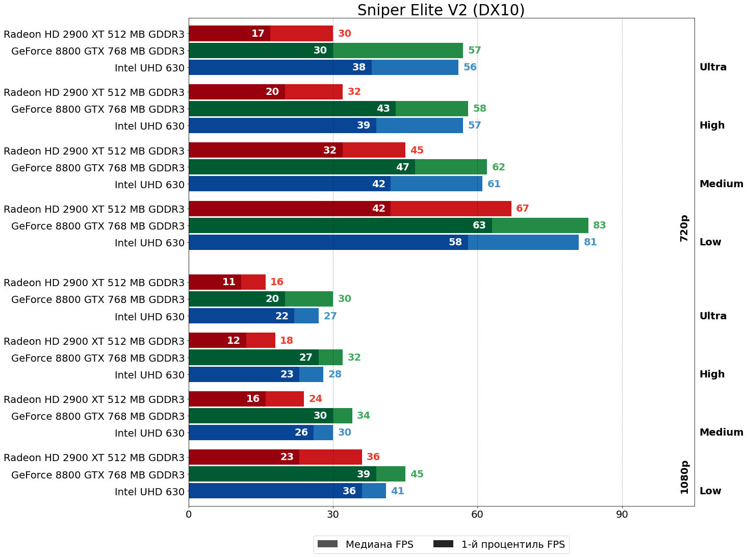 А вот во второй части Sniper Elite всё вновь очень плохо для HD 2900 XT — преимущество 8800 GTX огромно, в некоторых режимах более чем двукратное.