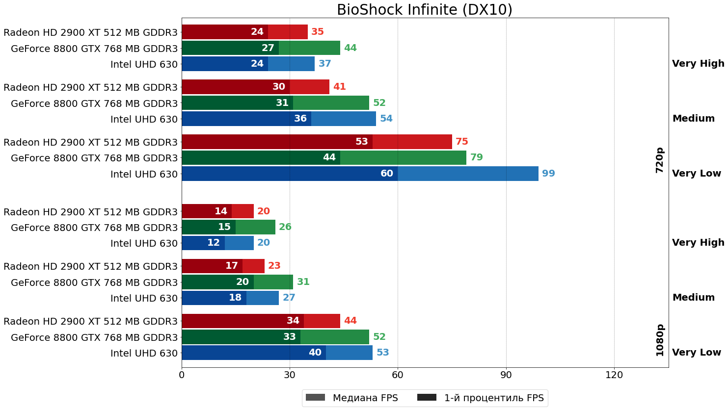 А вот BioShock Infinite к HD 2900 XT на фоне предыдущей пары игр крайне лоялен: 20–30% отрыв 8800 GTX от конкурента — ни разу не приговор.