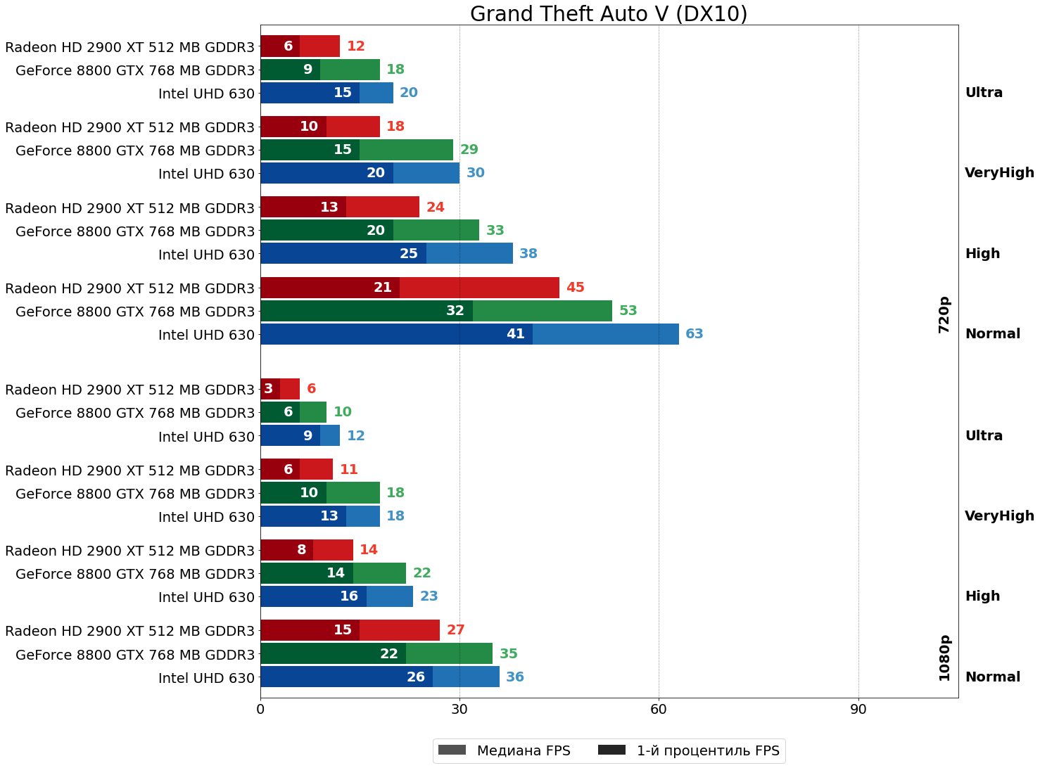 И, наконец, GTA V также симпатизирует карте NVIDIA — в HD-разрешении 8800 GTX впереди на 20–50%, а в FHD уже на 30–120%. Получается, в целом, что и в более поздних играх, за некоторыми исключениями, ускоритель NVIDIA показывает себя значительно лучше решения AMD, так что вряд ли в эпоху DirectX дело было в поголовной оптимизации игр под "зелёные" карты, архитектуры TeraScale у ATI/AMD просто вышла послабее Tesla от NVIDIA.