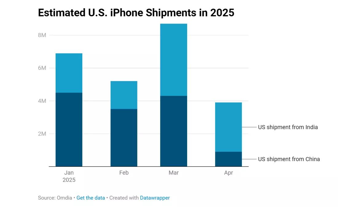 3,9 млн аппаратов iPhone, импортированных из обеих стран в апреле, заметно меньше, чем в другие месяцы этого года. Это связано с тем, что Apple перевезла пять самолётов с iPhone и другими продуктами — в общей сложности около 600 тонн — из Индии и Китая в США в течение трёх дней в последнюю неделю марта, перед первоначальным 10%-ным тарифом Трампа.