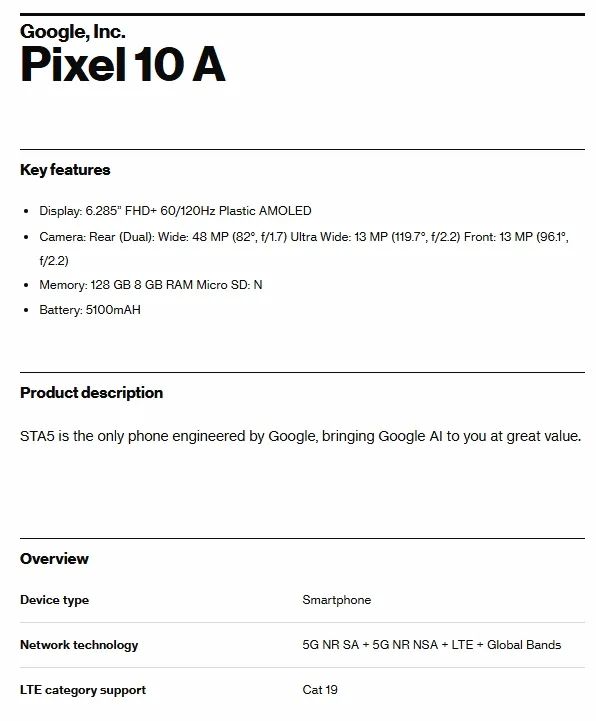 Инсайдер Эван Бласс опубликовал изображение характеристик будущего смартфона Google Pixel 10a у оператора мобильной связи Verizon. Перечень этих характеристик весьма мало отличается от выпущенного в первой половине нынешнего года Pixel 9a.