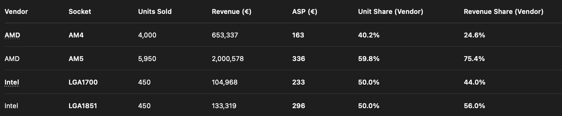 Наблюдатели полагают, что если AMD надумает возродить производство процессоров Ryzen 5800X3D и 5700X3D, самыми продаваемыми станут именно они. Пока же на долю процессоров под сокет AM4 приходится 40% продаж процессоров AMD на Amazon DE.