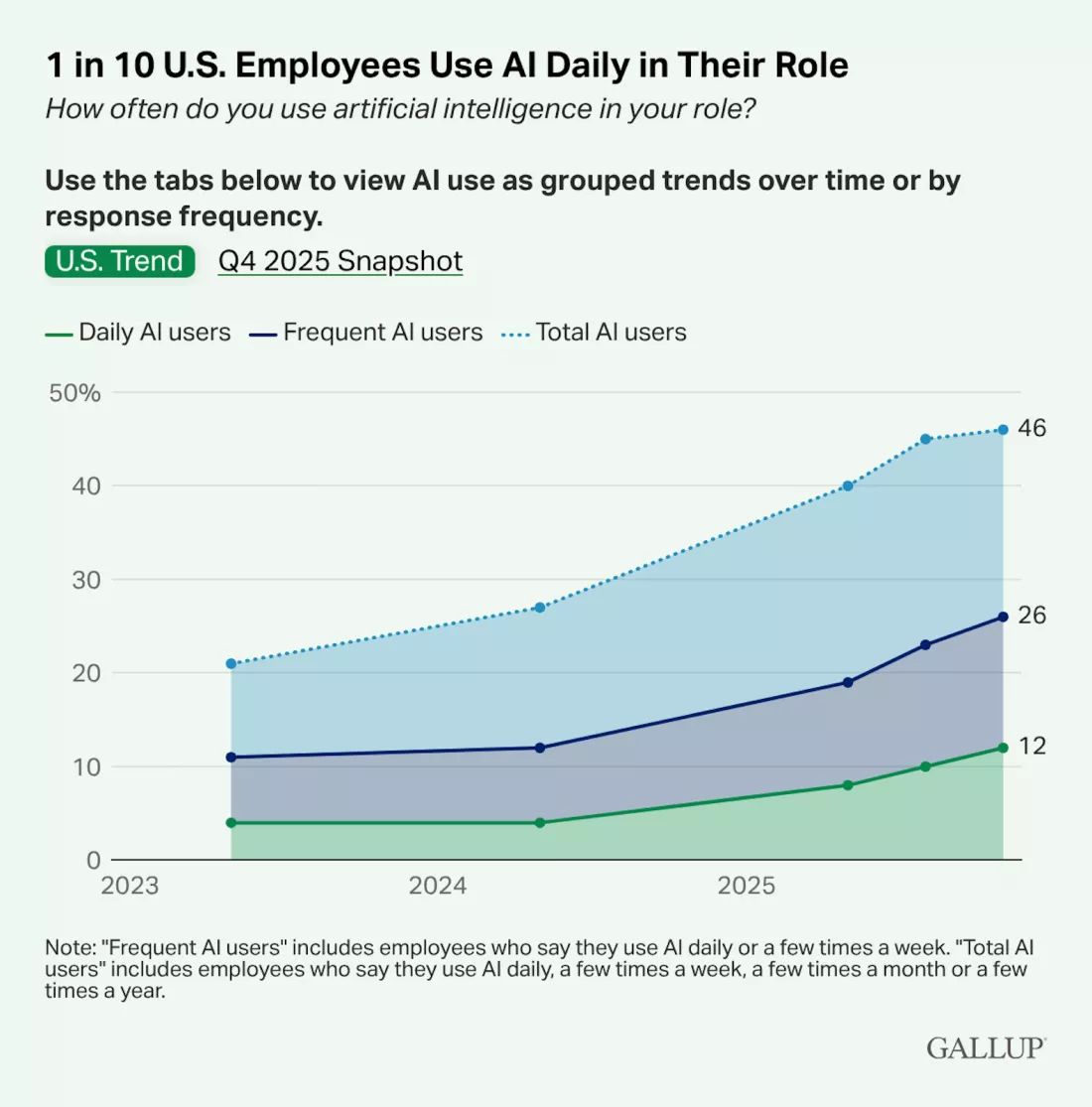 Опрос американского института общественного мнения Gallup относительно рабочей силы, который минувшей осенью охватил более 22 тысяч работающих взрослых людей, показал рост использования искусственного интеллекта. 12% опрошенных в США рассказали, что пользуются ИИ каждый день. 25% делают это чуть реже, но всё равно несколько раз в неделю. Хотя бы несколько раз в год применяют искусственный интеллект без малого половина участников опроса.
