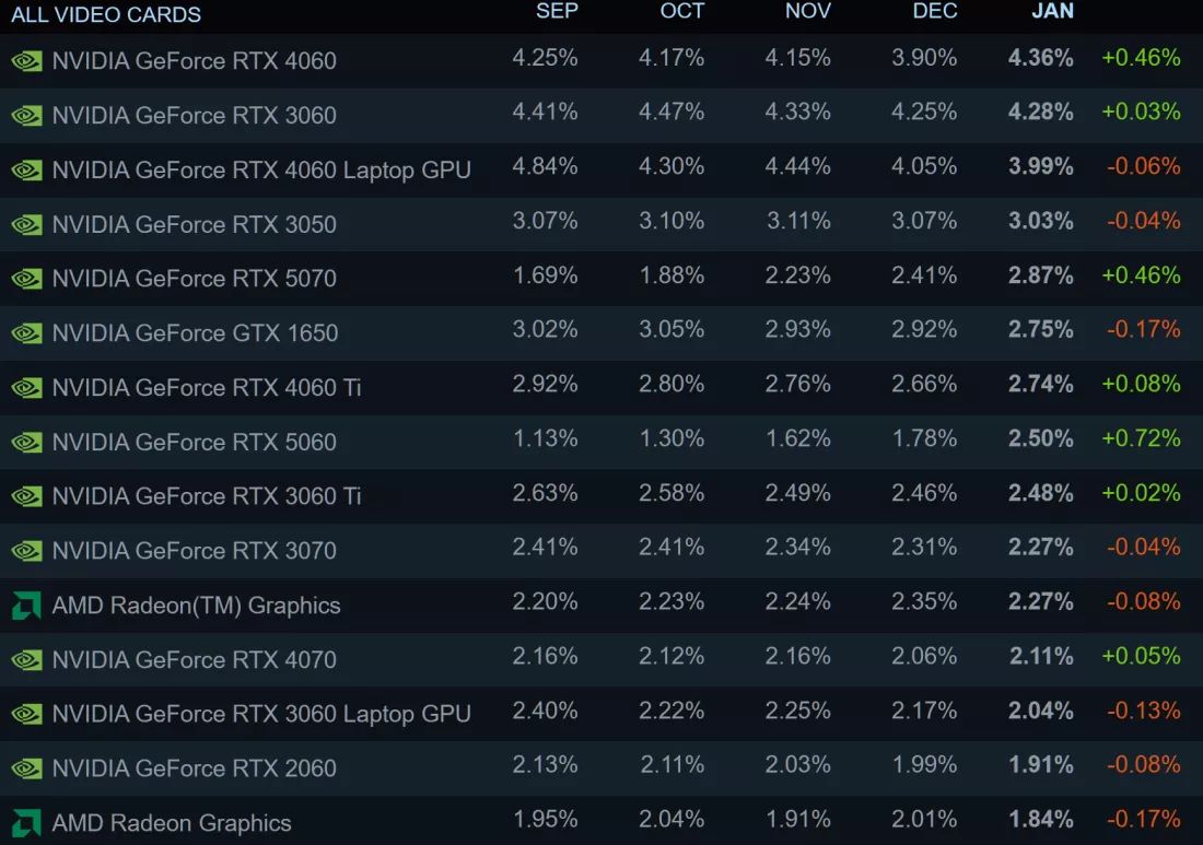 Среди наиболее популярных видеокарт продолжается борьба моделей RTX 3060, RTX 4060 и RTX 4060 для ноутбуков. На этот раз на первом месте оказалась RTX 4060. Среди более производительных видеокарт RTX 5060 выросла на 0,72% и занимает 8-е место. На 5-м месте находится ещё более мощная RTX 5070. Впервые в этом рейтинге появилась видеокарта Radeon RX 9070. Она является единственной здесь на архитектуре RDNA 4. В целом доля видеокарт NVIDIA составляет 73%, AMD — 18%, у Intel — 8% с учётом интегрированной графики.