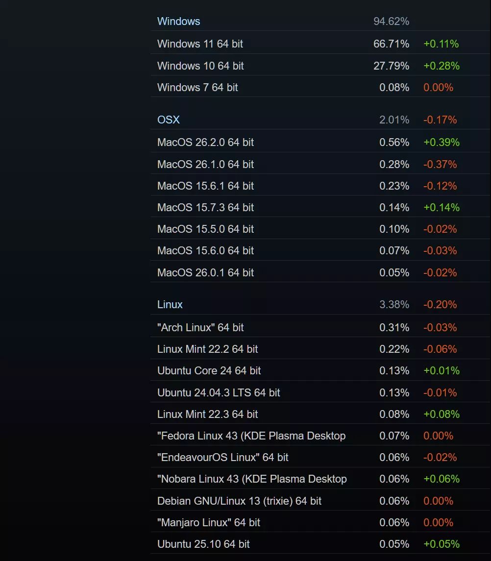 Выросло количество пользователей Windows 10, которых в Steam сейчас 27%. 0,08% продолжают работать с Windows 7.