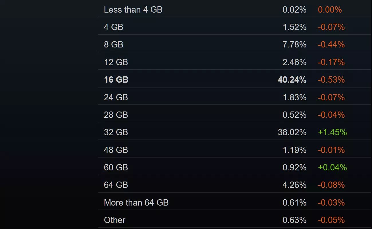 Как не удивительно при нынешних ценах, выросло число пользователей с объёмом оперативной памяти 32 ГБ. Это всего на 2% меньше, чем пользователей с объёмом 16 ГБ, которые пока в большинстве.