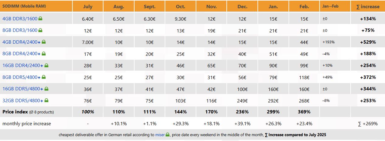 В январе продолжился рост стоимости памяти для ноутбуков, который составил 23,4% за месяц и 369% с середины 2025 года. Модули DDR4 2400 SO-DIMM объёмом 4 ГБ только за январь подорожали на 193%. SO-DIMM DDR5-4800 объёмом 8 ГБ стали дороже на 49%. Можно предположить, что очень скоро это отразится на ценниках на ноутбуки в магазинах.