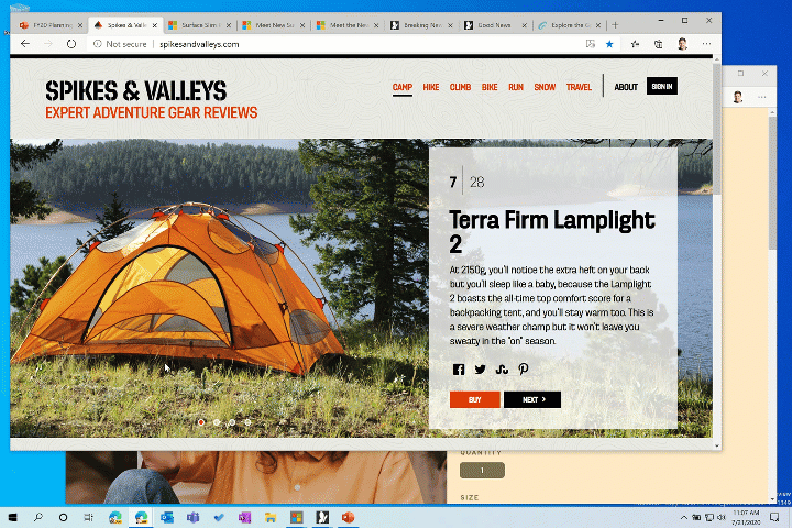 Одной из новых возможностей является быстрый доступ к прикреплённым сайтам в браузере Edge. Если нажать на изображение сайта на панели задач, превью всех открытых на этом сайте вкладок можно будет увидеть во всех окнах Edge. Для этого требуется версия Microsoft Edge Insider Build 85.0.561.0 или новее. Чтобы эта функциональность работала, нужно прикреплять сайты уже после установки сборки. Ранее закреплённые сайты не поддерживают такую возможность.