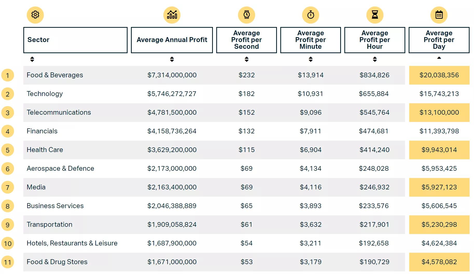 Казалось бы, технологический сектор должен быть наиболее прибыльным в списке Fortune 500. Хотя он приносит прибыль $182 в секунду ($15,7 млн. в день), технологии отстают от продуктов питания и напитков, которые приносят $232 в секунду (более $13000 в минуту) при ежедневной прибыли в $20 млн.