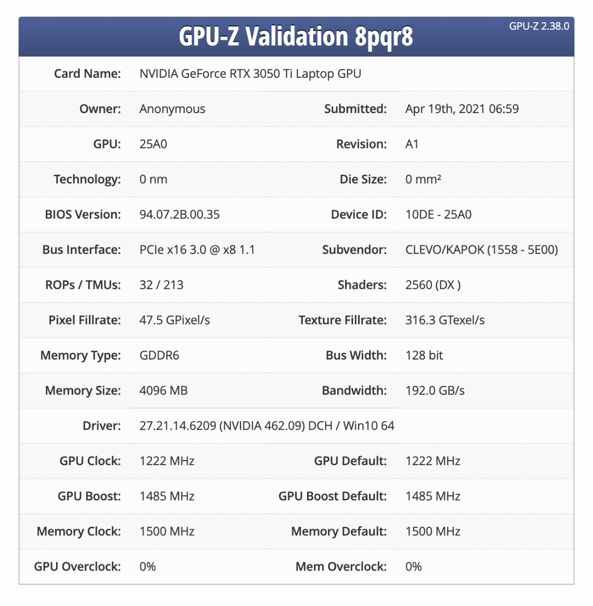 Подтверждена информация о том, что данные видеокарты основаны на графическом процессоре Ampere GA107. GA107 отсутствует в видеокартах для персональных компьютеров. Карты были использованы в невыпущенном ноутбуке. RTX 3050 Ti будет наиболее мощной видеокартой на основе GA107.