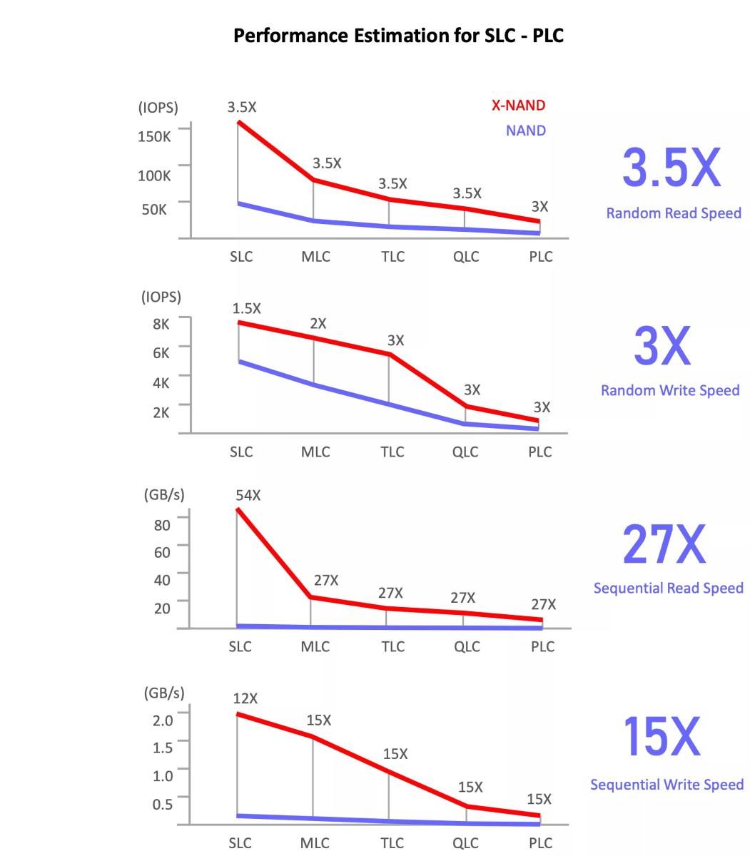 Если сравнивать с привычными многоуровневыми ячейками, X-NAND сокращает размер буфера на 94%, что позволяет увеличивать количество слоёв с 2-4 до 16-64 на кристалл. Это повышает параллельность чтения и записи и вместе с тем производительность.