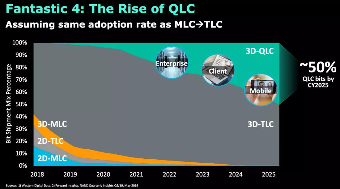 Если сравнивать с QLC, новая технология теоретически повышает скорость последовательного чтения в 27 раз, записи в 15 раз, чтения и записи случайных блоков данных втрое. Размер чипа NAND уменьшается и с ним уменьшается энергопотребление, а производственные расходы остаются на уровне QLC. С долговечностью всё не так просто.