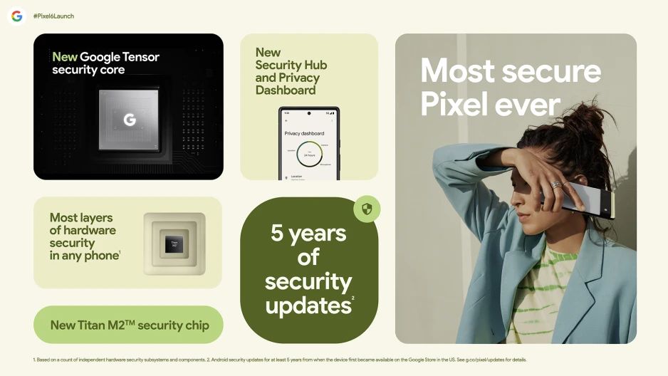 В процессор встроено ядро безопасности Tensor и ещё применяется чип безопасности Titan M2, где хранятся пароли и ключи двухфакторной аутентификации. Security Hub в одном месте позволяет смотреть настройки безопасности и даёт по ним рекомендации. Пользователи будут знать, какие приложения в данный момент имеет доступ к микрофону и камерам.