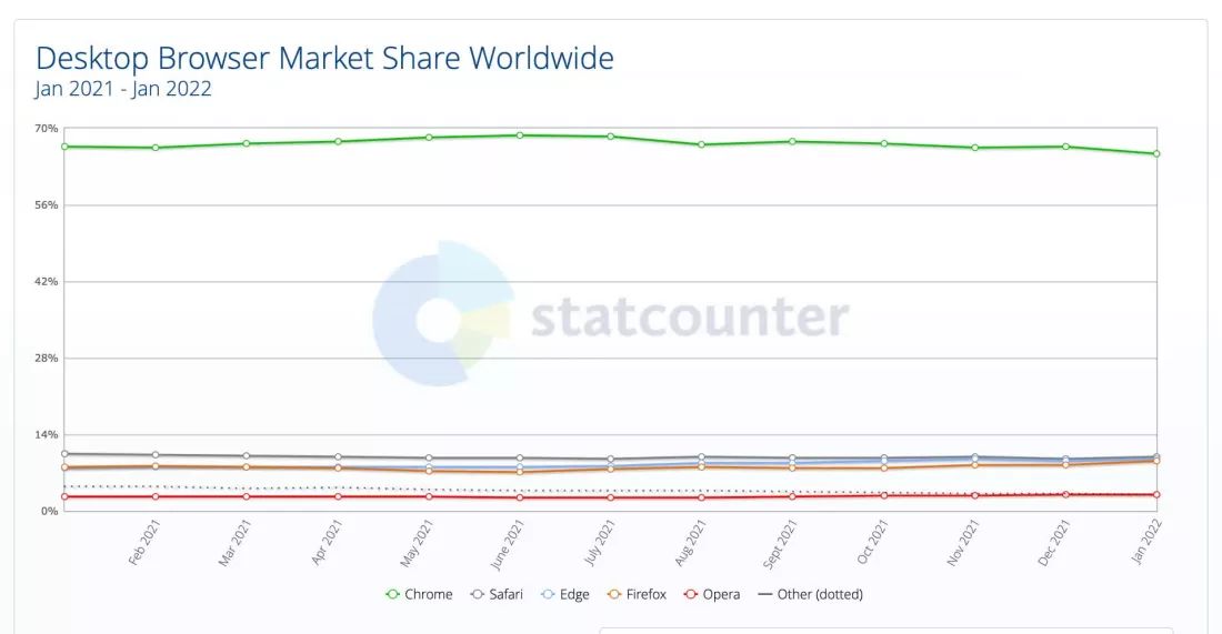 Много лет статистика браузеров на компьютерах показывает доминирование Google Chrome без шансов для остальных. Согласно последнему отчёту StatCounter, в январе Chrome занимал 65,38% рынка браузеров на ПК. За год Chrome потерял 1,25%.