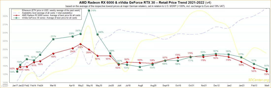 Отчёт 3DCenter показывает, что карты серий RTX 3000 и Radeon RX 6000 в немецких розничных магазинах выше рекомендованных розничных цен на 41% и 35% соответственно. Как видим, до рекомендованных цен ещё далеко, но это минимальное значение с января прошлого года. Тогда разница была 42% у AMD и 34% у Nvidia.