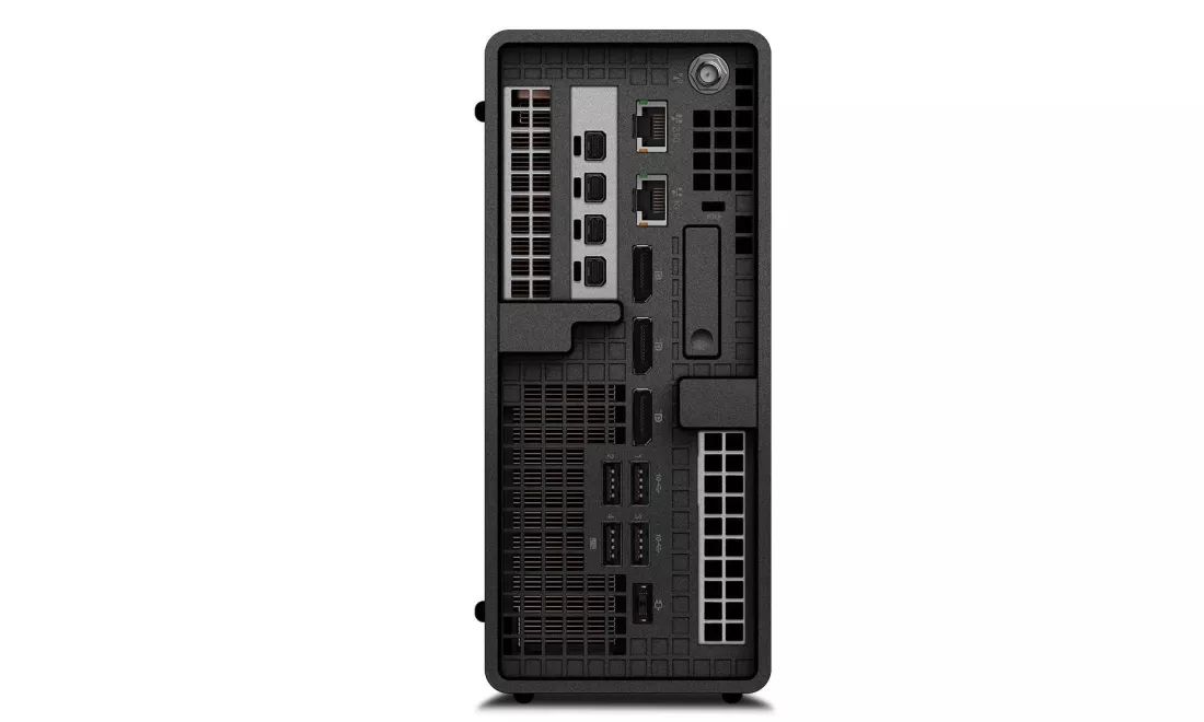Среди разъёмов на передней панели есть два порта Thunderbolt 4, один USB 3.2 Gen2 Type-A и комбинированный аудиоразъём. Сзади ещё четыре порта USB 3.2 Gen2 Type-A, два LAN RJ-45 (один 2,5GbE и один 1GbE) и до семи DisplayPort (три подключенных к iGPU полноразмерных и дополнительно четыре мини-порта DisplayPort, если выбрать дискретную видеокарту).