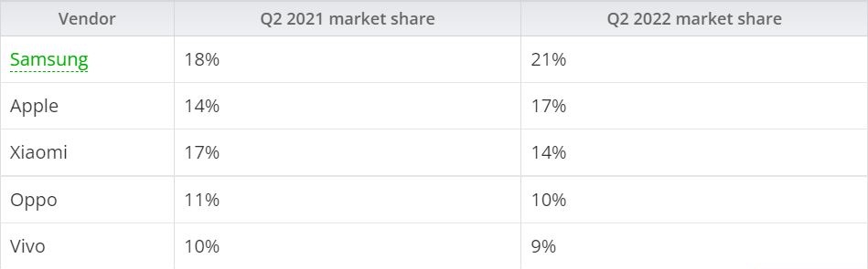 Мировые поставки смартфонов сократились на 9% по сравнению с этим же периодом прошлого года. Доля Samsung сейчас 21% за счёт востребованности смартфонов средней ценовой категории Galaxy A. Apple вторая с 17%, поскольку дорогие iPhone 13 покупают в больших количествах. Следом располагаются Xiaomi, Oppo и Vivo, потерявшие за год от 1% до 3%.