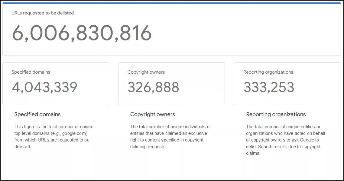 Google получила 6.006.830.816 запросов на удаление из индекса от 326.888 правообладателей. Большая часть этих запросов была удовлетворена. Из более чем 6 млрд ссылок 4.043.339 были доменами верхнего уровня. Запросов от действующих от имени своих клиентов-правообладателей организаций было 333.253.