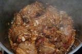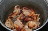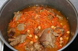 Так как я готовил на электроплите, буду циферки мощности называть (6 - максимум).Ставим казан раскаляться на 6. Как разогреется - прямо без масла кладем туда мяско 1-м слоем, жирком к стенкам.