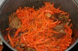 Доливаем кипяточка грамм 100-200 и маслеца грамм 50. Скручиваем мощность плиты на 4 (до этого всё время пусть 6 будет). Перемешиваем, закрываем крышечкой и минут 10-15 пусть морковка там тусит. Мешаем периодически.