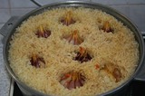 НЕ МЕШАЕМ! Собсна, вот почти и всё. Когда время выйдет, снимаем крышку, снимаем с огня. Вытаскиваем чеснок, кладем на блюдечко. Берем либо большое блюдо, либо еще какую широкую открытую посудину, и переворачиваем туда казан. Рис получится снизу, а мясо с варевом сверху. Мясо тоже выколупываем и рядом складываем на тарелочку. Рис и варево перемешиваем. По идее рис не должен превратиться в кашу, а быть рассыпчатым и нежным. Мясо освобождаем от костей (если есть) и нарезаем мелкими ломтиками, чтобы сразу кусочек съесть можно было, а не резать в тарелке. Собственно, плов подается на блюде большом, горкой в форме вулкана. Сверху кусочками горка мяса. А по периметру склонов воткнут чеснок. Чеснок, кстати, очень вкусный, его едят, тока без шкурки