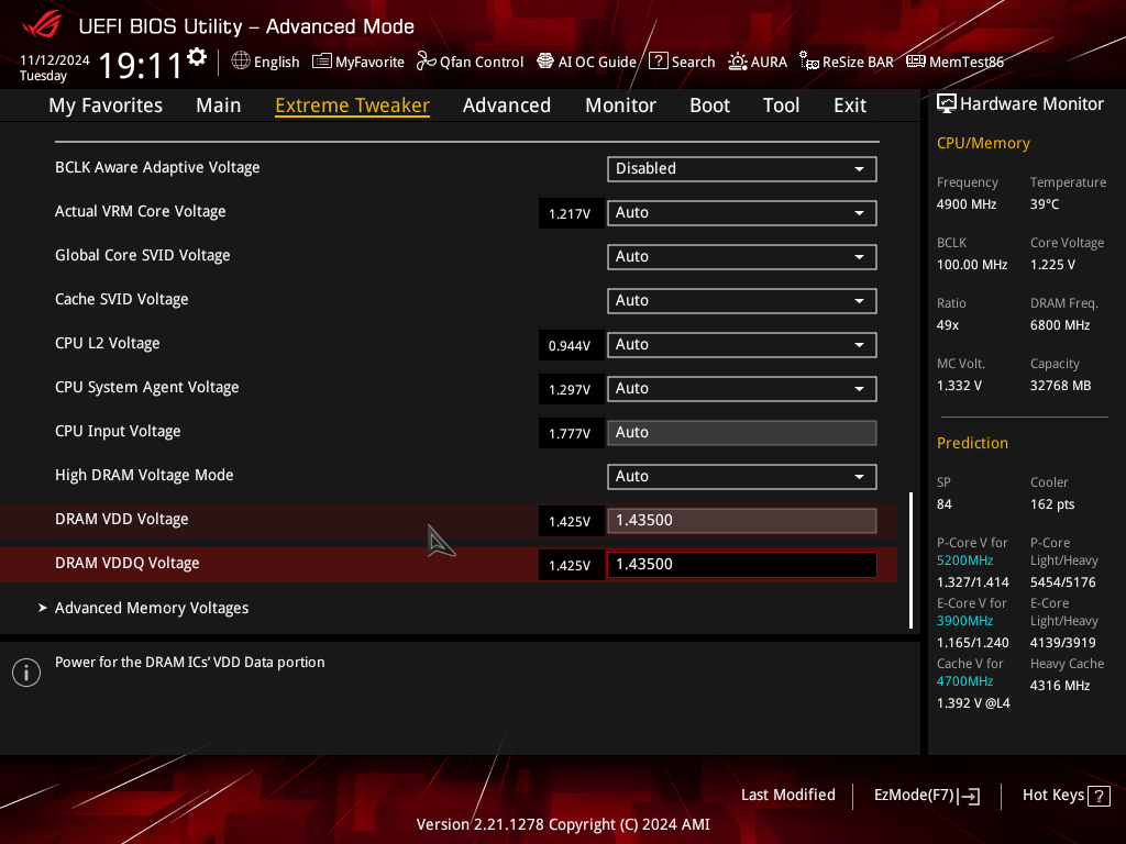 Частота 6800 МГц при тех же задержках 30–40–40 – это какой-никакой, но успех. При этом нагрев модулей остался на невысоком уровне, а система сохраняла полную стабильность. Повышать напряжение выше 1.45В я не хотел. А 1.45В не дали даже стабильность на 7000 МГц с более высокими задержками. Поэтому режим 6800–30–40–40 в данном случае можно считать оптимальным. А более тонкий подбор напряжения позволил установить, что стабильность в таком режиме сохраняется при 1.42В. Его я в итоге и оставил.