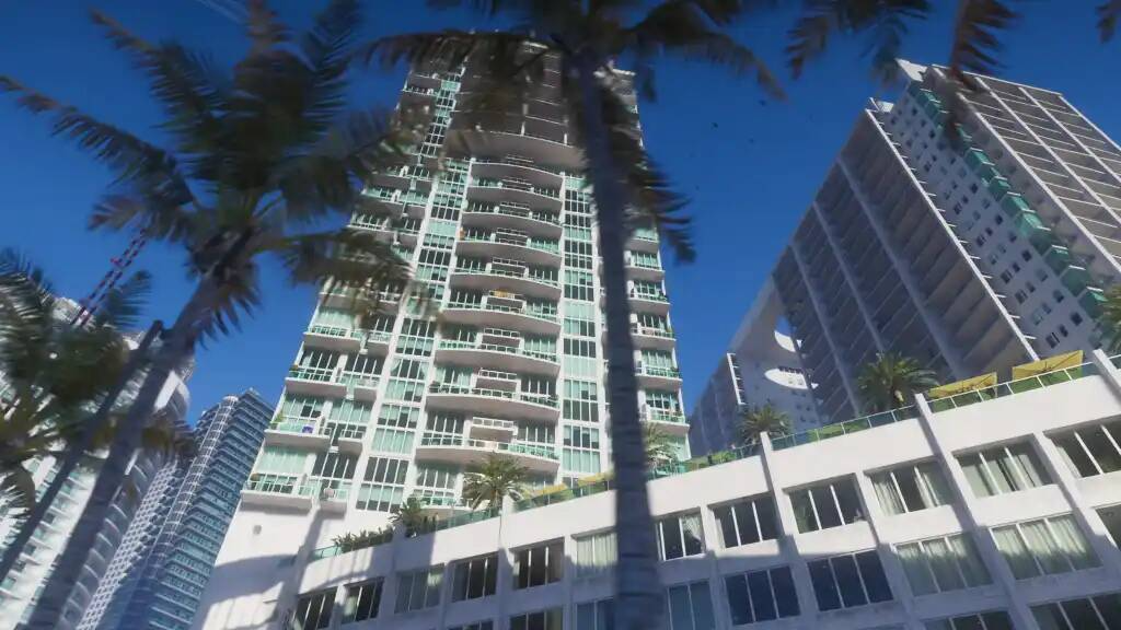 13 - Архитектурный дизайн вдоль береговой линии отражает стиль Майами, при этом некоторые сооружения являются цифровыми копиями реальных зданий, таких как кондоминиумы 500 Brickell.