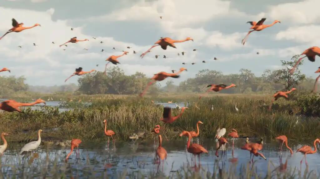 15 - Изображенные водно-болотные угодья богаты дикой природой, включая фламинго и крокодилов, на фоне детализированной растительности, похожей на протоку в Red Dead Redemption 2.
