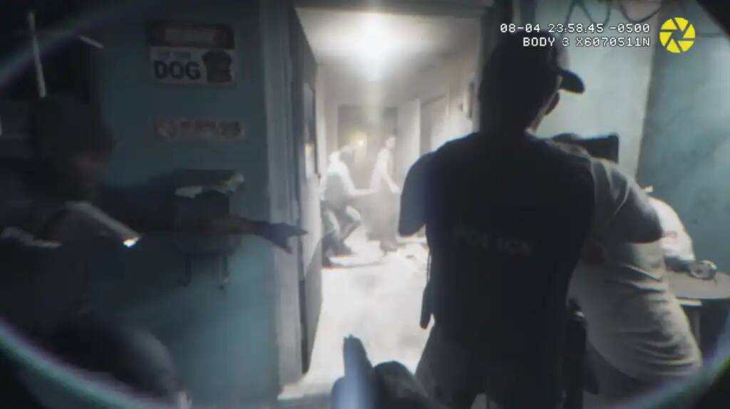 51 - На кадрах с камеры наблюдения видно, что, по-видимому, сотрудники правоохранительных органов под прикрытием силой проникают в квартиру. Сбоку виден знак, предупреждающий о собаке, с изображением, напоминающим Чопа из GTA 5.